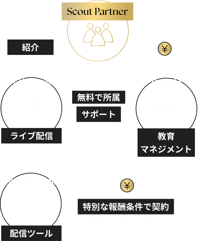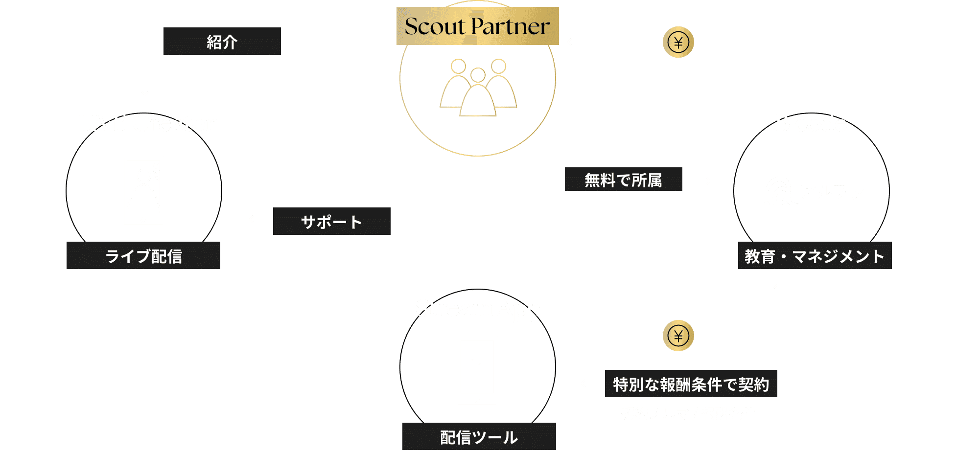 配信アプリからライバー事務所に入る収益をスカウトパートナーとシェアするビジネスです。